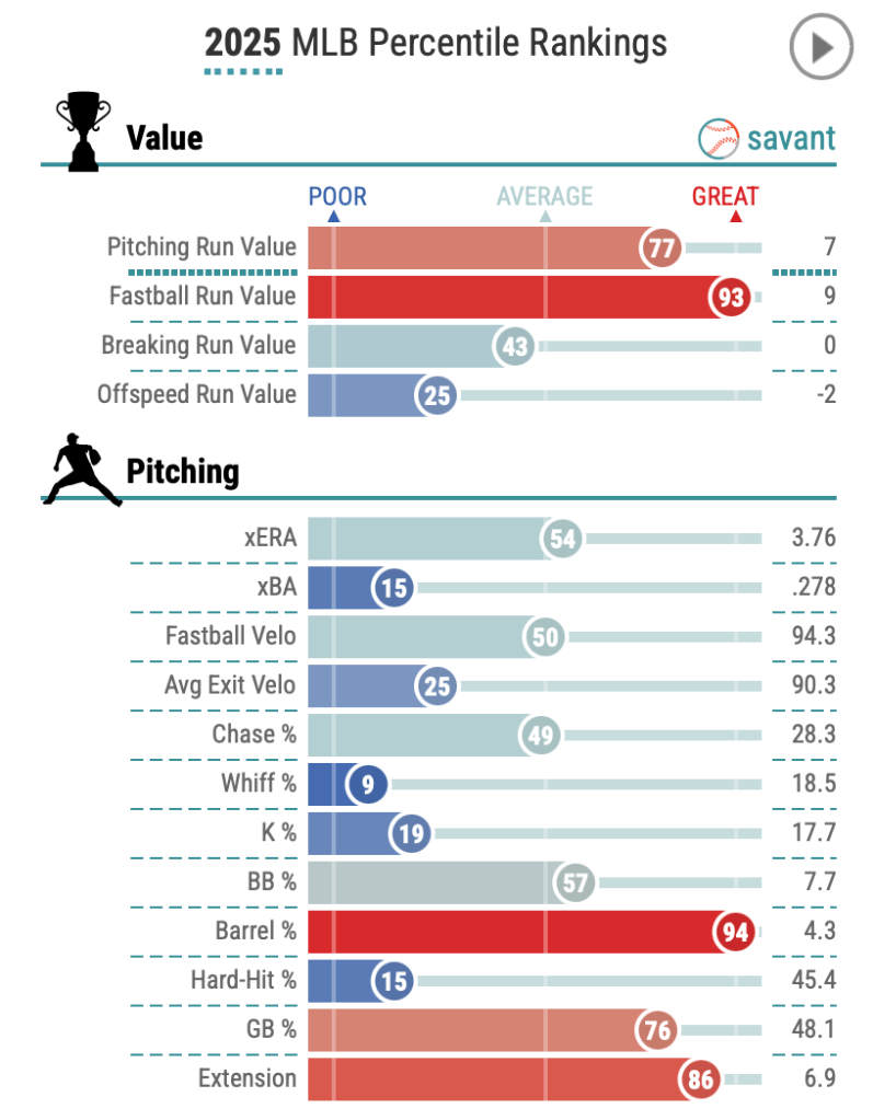 He’s not going to dominate you with strikeouts (19th percentile in K%, 9th percentile Whiff%), but he limits fly balls and promotes groundballs (48.1% GB%, 76th percentile). With a fastball run value in the 93rd percentile with average velocity in the 50th percentile means Houser is sequencing and locating effectively.