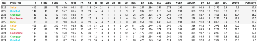 If you take a look at Houser’s Baseball Savant page, you’ll notice he throws five different pitches. As I mentioned in my Mitch Keller write-up, any pitcher throwing more pitches versus fewer is going to have an advantage against the hitter based on pure uncertainty from the guy with the bat in hand. He primarily throws that sinker (45% usage rate) and mixes in a curveball, changeup, 4-seam fastball and slider here and there. The sinker and changeup mirror each other in movement despite a 10 mph velocity gap, a tunneling advantage that likely plays a key role in deception. His changeup (39.4% Whiff%) and curveball (33.3% Whiff%) have quietly become real weapons.