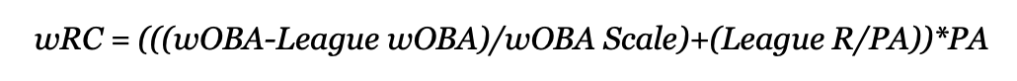 What this equation is doing (from left to right) is taking the difference of a player’s wOBA and the league-average wOBA (League wOBA), then dividing that by the wOBA Scale, which is a constant that can be found online for a given year very easily. Thereafter, you simply take the league’s runs per plate appearance (which can also be found online) and multiply that by the player’s total plate appearances.