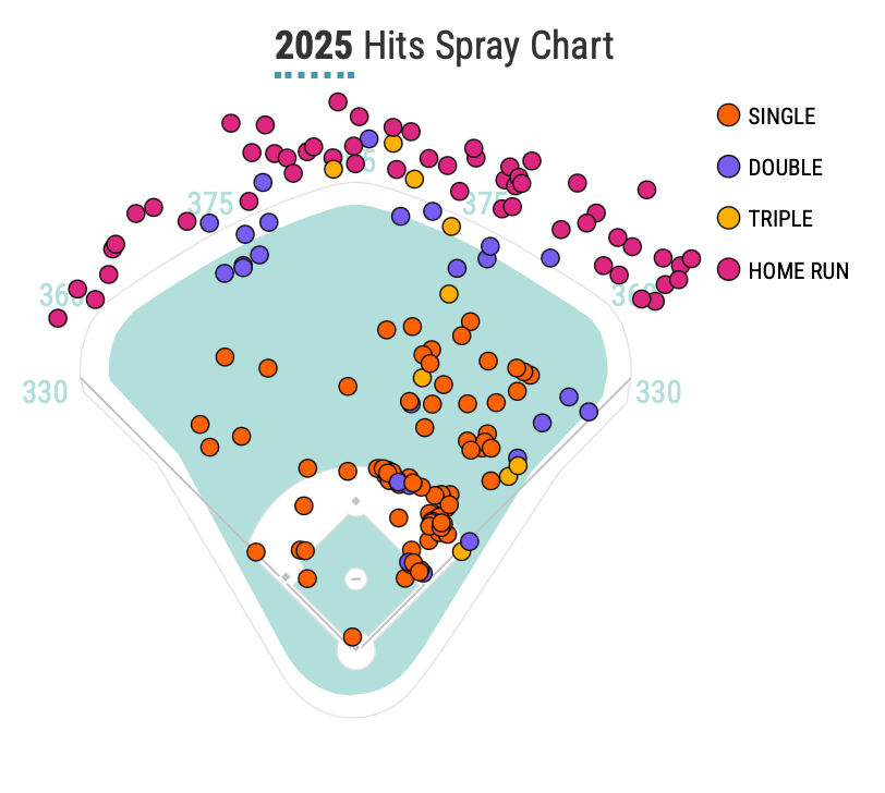 He punishes the baseball that dares meet his bat. You see it in the film, you see it in the numbers. Pitchers are unsure how to pitch him because he will take a fastball at his chin 460 to right and he will also take a slider away down the left field line. Take a look at his spray chart, and keep in mind he’s a lefty batter: